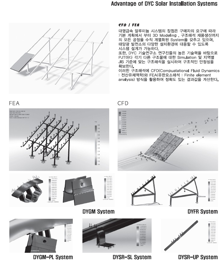 作為一個工業界鋁製太陽能裝置系統的領導者,本公司採用先進的計算流體力學﹝CFD﹞與有限元素分析﹝FEA﹞工具。在生產之前完成測試修正,使太陽能裝置系統達到最佳化。