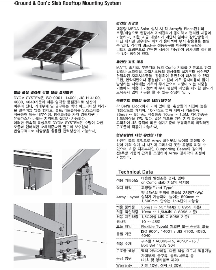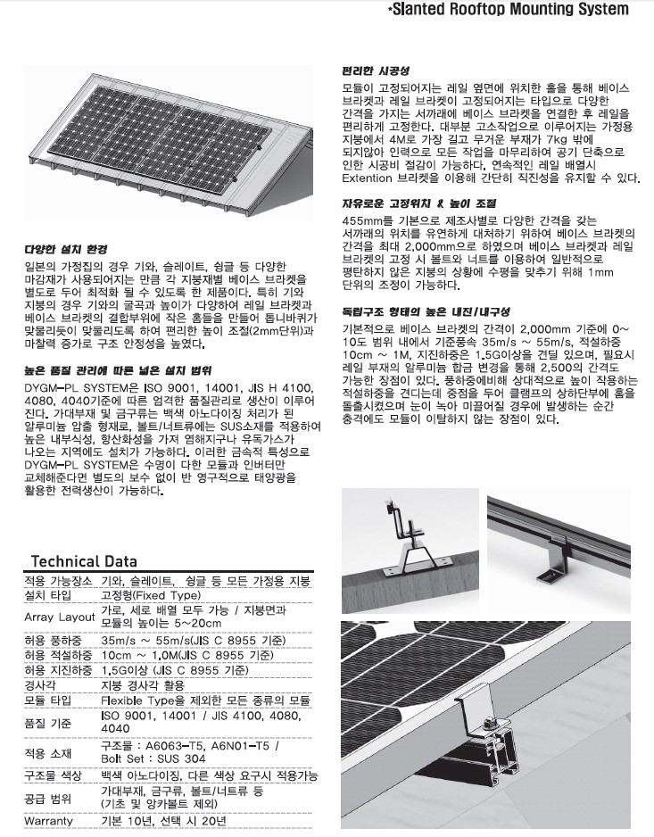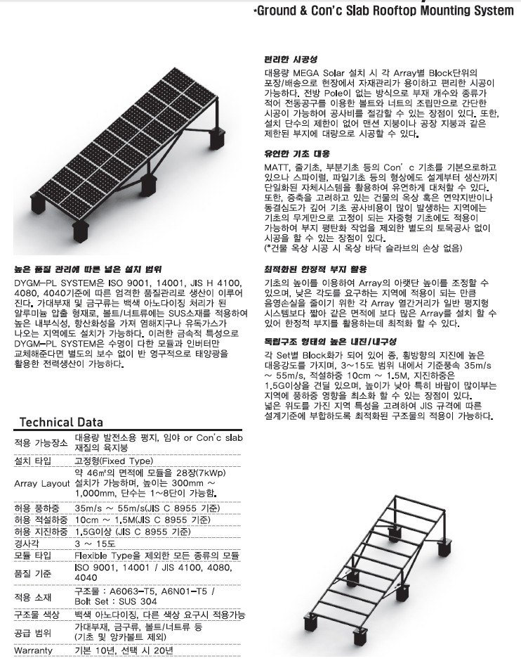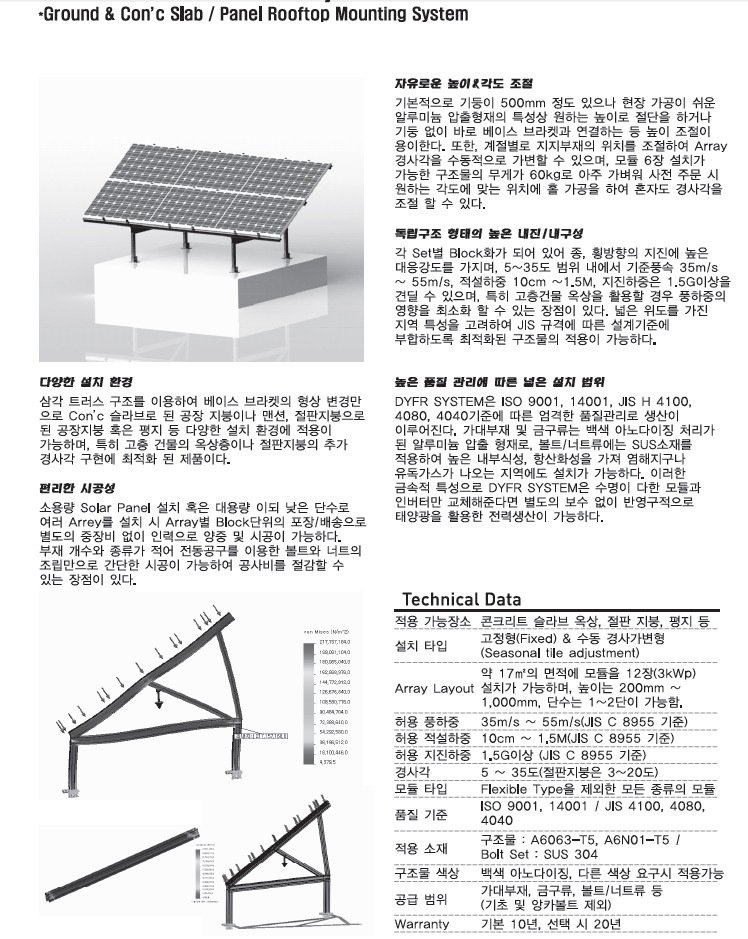 同時也考量各種不同的外在因素﹝如:地點、土攘狀況、溫度以及氣候﹞提供各種不同環境的架設,如平面型屋頂的架設、斜面型屋頂架設以及地面架設等系統。