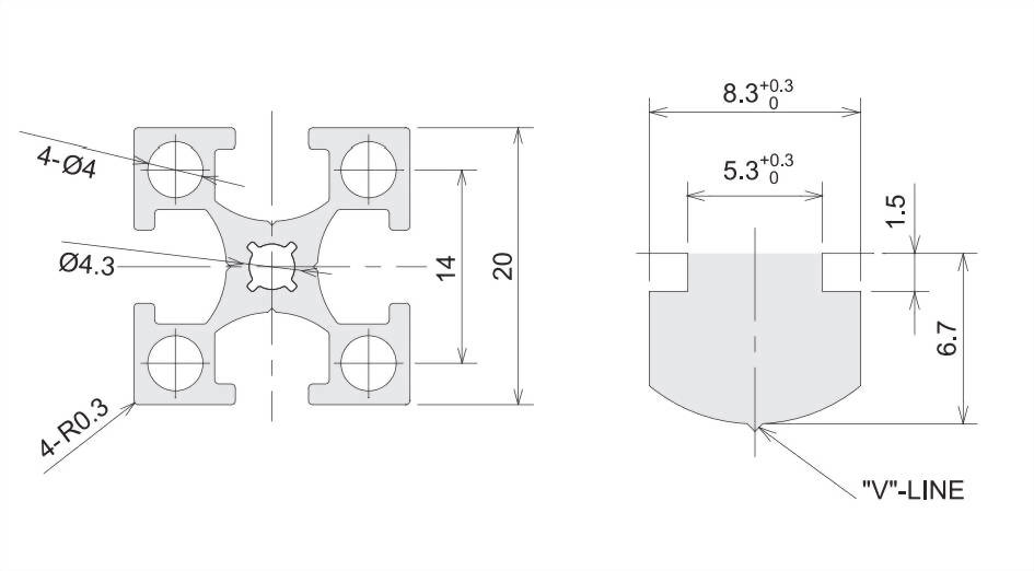 通用2020鋁擠型規格,槽寬5.3mm,其他2020可參考下方連結