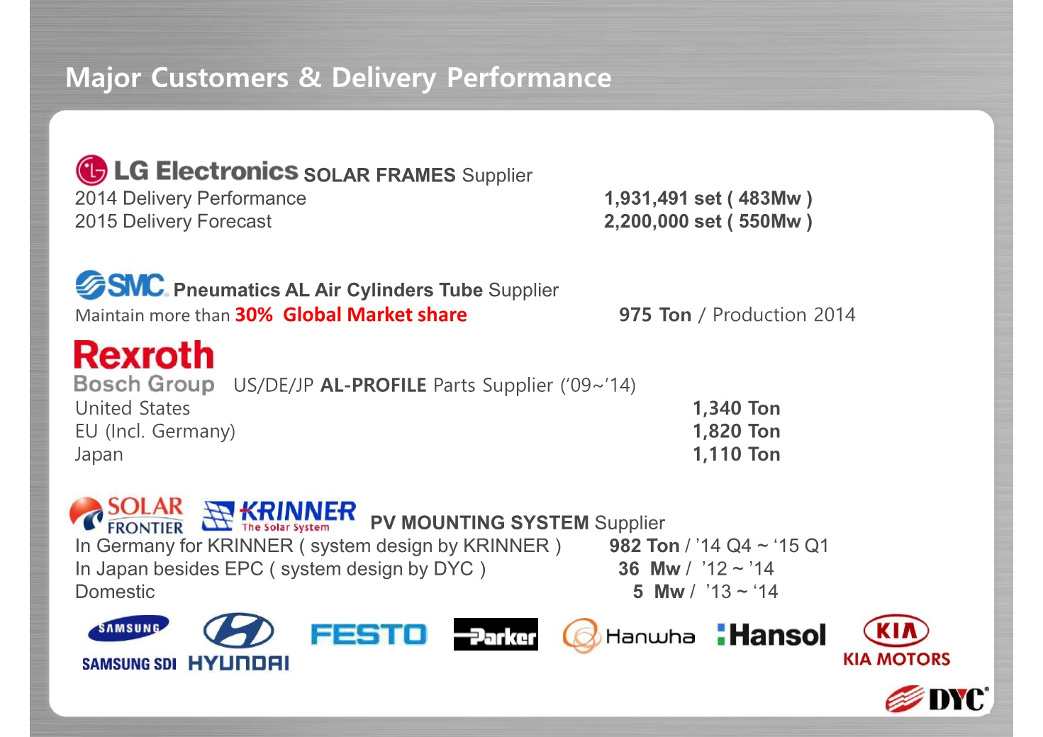 LG Electronics SOLAR FRAMES Supplier, SMC Pneumatics AL Air Cylinders Tube Supplier, Rexroth Bosch Group, SOLAR FRONTIER, KRINNER The Solar System, SAMSUNG SDI, HYUNDAI, FESTO, Parker, Hanwha, Hansol, KIA MOTORS.